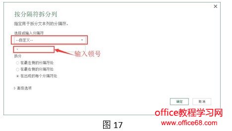 第五步:弹出“按分隔符拆分列”对话框,在下拉列表中选择“自定义”选项,在输入框中输入“顿号”,再单击确定。