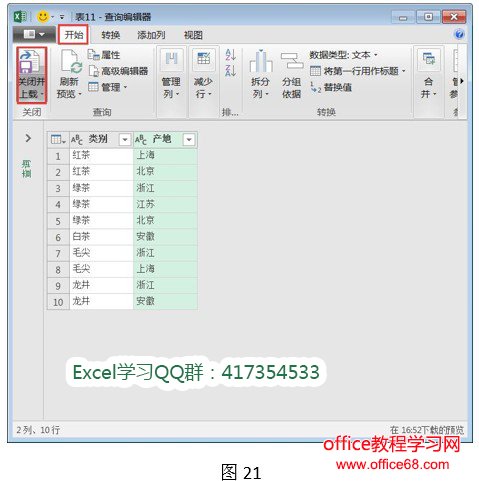 第九步:选择“开始”选项卡,单击“关闭并上载”按钮,关闭表格查询编辑器。