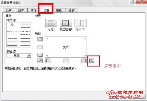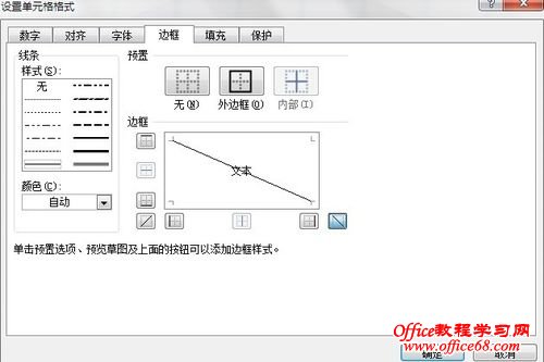 2,点击设置单元格格式,进入对话框界面,选择边框,然后我们看到在右下角有个图标,我们点击他,就会在中间出现一线斜线,点击确定。