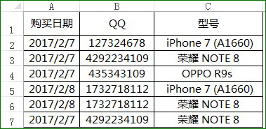 ![]() 结论:如果勾选所有列字段,删除重复数据,Excel会将所有字段内容都重复的数据删除,比如上面第7行和第3行的数据完全一样,Excel才会做删除处理。而5、6行只有购买日期和QQ一样,型号不一样,所以没有被删除。