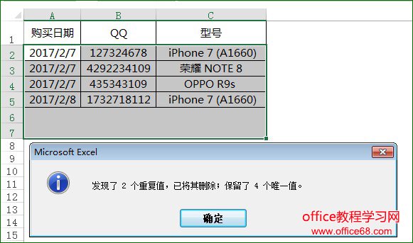 ![]() 确定后,Excel给了我们这样的提示:发现2个重复值,已删除。