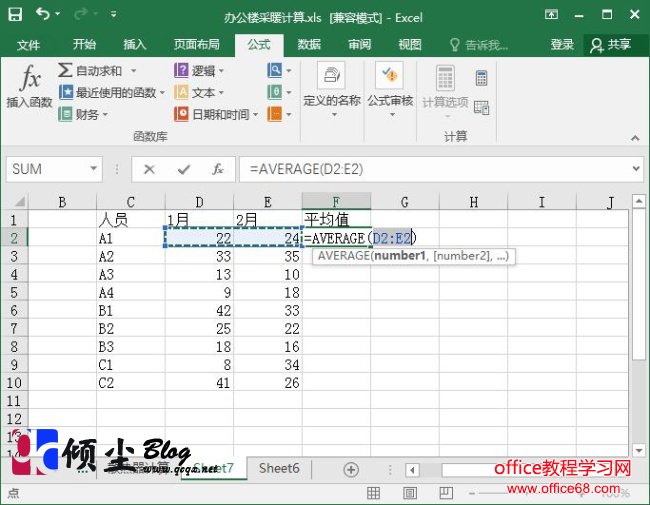 2、此时F2中显示出“=AVERAGE(D2:E2)”,点击回车键。其中D2:E2根据要去平均值单元格的范围来定。