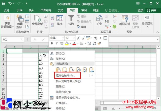 3、点击鼠标右键,打开对话框,单击【选择性粘贴】按钮。如图