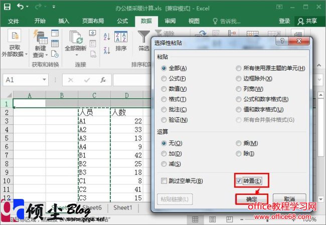 4、打开【选择性粘贴】对话框,勾选【转置】,单击【确定】按钮关闭对话框。如图 5、此时实现行和列的互换。如图