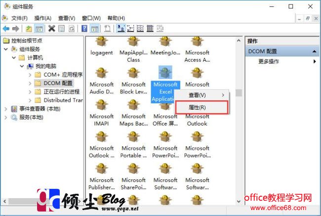 3.选择完DCOM配置之后从右侧找到“Microsfot Excel application”文件,找到之后在其上右键选择“属性”。如下图