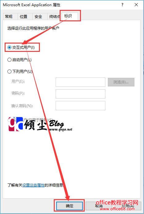 4.在弹出的“Microsfot Excel application属性”中选择【标识】选项卡中的【交互式用户】,选好之后点击确定完成操作。如下图