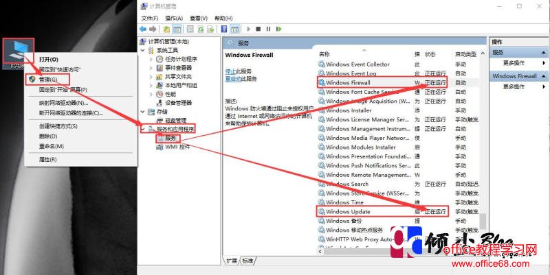 解决方法下面说下此问题的两种解决方法。 方法一在系统的服务中查看Windows Firewall服务 和Windows Update服务是否开启,如果没有开启就把他们启动一下。 1.在桌面的【计算机】上选择右键选择【管理】,在弹出的计算机管理中点击【服务和应用程序】—【服务】。 2.在右侧服务界面找到Windows Firewall 和Windows Update这两个服务