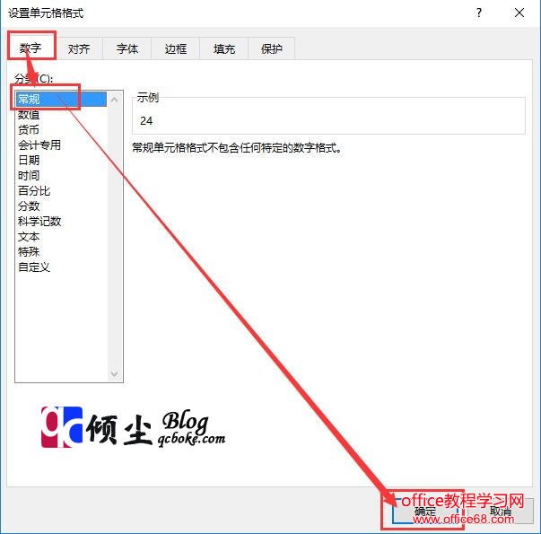 3.在中选的单元格上“鼠标右键”选择“设置单元格格式”选项,在弹出的“设置单元格格式“对话框中分类选择”常规“,完成之后点击”确定“。如下图
