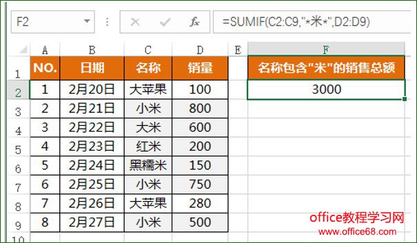 =SUMIF(C2:C9,"*米*",D2:D9)