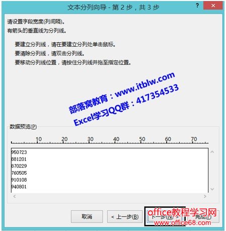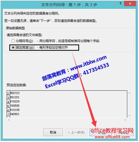 2.此时将打开“文本分列向导”对话框,在对话框的“原始数据类型”栏中选择“固定宽度”单选按钮,单击“下一步”按钮进入下一步设置,如下图所示。