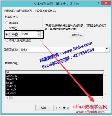 4.此时将可以设置数据格式。这里在“列数据格式”栏中选择“日期”单选按钮,同时会在其后的下拉列表中选择日期的格式,此时,选择数据将转换为日期型数据,如下图所示。