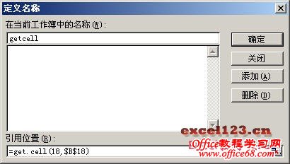 宏表函数GET.CELL是在早期低版本Excel中使用的函数,其作用是返回引用单元格的信息。它仍可以在高版本的工作表中使用,不过不能直接用在单元格中,而只能通过定义的名称的方式来使用。下面介绍其使用方法,在结尾处提供一示例文件供下载。 一、语法: GET.CELL(Type_num, Reference) Type_num指明单元格中信息的类型。用数字表示,范围为1-66。 Reference为引用的单元格或区域。 二、使用方法: 例如我们要返回B9单元格中字体的名称,可以用下面的方法: 1.选择某个单元格,单击菜单“插入→名称→定义”,打开“定义名称”对话框。 2.在“在当前工作簿中的名称”下方的文本框中输入一个名称,如“getcell”,也可以设置一个其他名称,在“引用位置”下方的文本框中输入公式: =get.cell(18,$B$18) 注意公式中的第二个参数为绝对引用,如果为相对引用,则与当前选择的单元格与B18单元格的相对位置有关,从而不能在任意单元格用公式“=getcell”返回正确的结果。 3.在需要引用B18单元格字体信息的单元格中输入公式: =getcell 即可返回B18单元格中的字体名称。 三、GET.CELL函数的刷新: 四、Type_num 参数的含义: 1 单元格的绝对引用。 2 引用区域中顶部单元格的行标。 3 引用区域中最左边单元格的列标。 4 类似TYPE函数 5 返回引用单元格内容。 6 返回引用单元格中的公式。 7 返回单元格的数字格式(如“m/d/yy”或“General”)。 8 指示单元格水平对齐的数字。1 = 一般 2 = 左对齐 3 = 置中 4 = 右对齐 5 = 填充 6 = 两端对齐 7 = 跨列置中 9 指示分配给单元格左侧边框线的类型。0 = 无边框 1 = 细线 2 = 中等线 3 = 虚线 4 = 点线 5 = 粗线 6 = 双线 7 = 发丝线 10 指示分配给单元格右侧边框线的类型,对应指定返回值的描述参见 type_num 9 11 指示分配给单元格顶端边框线的类型,对应返回值的描述参见 type_num 9 12 指示分配给单元格底端边框线的类型,对应返回值的描述参见 type_num 9 13 用数字形式返回引用单元格图案。 14 如果单元格被锁定,返回TRUE;否则,返回FALSE。 15 如果单元格中公式被隐藏,返回TRUE;否则返回FALSE。 16 返回单元格列宽。 17 用点表示的单元格的行高 18 返回字体名称,文字形式 19 用点表示的字体大小 20 如果单元格中所有字符或只有第一个字母为黑体,返回TRUE;否则,返回FALSE。 21 如果单元格中所有字符或只有第一个字符为斜体。返回TRUE;否则,返回FALSE。 22 如果单元格中所有字符或只有第一个字符为加底线,返回FALSE。 23 如果单元格中所有字符或只有第一个字符为加删除线,返回TRUE;否则,返回FALSE。 24 是1-56的一个数字,代表单元格中第一个字符的字体颜色。如果字体颜色为自动生成,返回0。 25 如果单元格中所有字符或只有第一个字符为空心体,返回TRUE;否则,返回FALSE。Microsoft Excel for Windows 不支持空心字体格式。 26 如果单元格中所有字符或只有第一个字符加阴影,返回TRUE;否则,返回FALSE。Microsoft Excel for Windows 不支持阴影字体格式 27 指示单元格中能否进行手动分页线的数字。0 = 没有分页线 1 = 行 2 = 列 3 = 行和列 28 行的级数(分级显示) 29 列的级数(分级显示) 30 如果所包含的活动单元格为摘要行,返回TRUE;否则,返回FALSE。 31 如果列所包含的活动单元格为摘要列,返回TRUE;否则,返回FALSE。. 32 如窗口只包括一个表,其文件名为不含扩展名的工作簿的文件名,为包含单元格的工作簿或工作表的文件名,以 BOOK1.XLS 的形式返回簿的文件名;否则,以"[BOOK1]sheel"的形式返回表的文件名。 33 如单元格被自动换行,返回TRUE;否则,返回FALSE。 34 代表左侧边框线颜色。如颜色自动生成,返回零。 35 代表右侧边框线颜色。如颜色自动生成,返回零。 36 代表顶端边框线颜色。如颜色自动生成,返回零。 37 代表底端边框线颜色。如颜色自动生成,返回零。 38 代表前景颜色。如颜色自动生成,返回零。 39 代表背景颜色。如颜色自动生成,返回零。 40 单元格格式,文字形式。 41 不经翻译返回活动单元格中的公式(用于图别设定的宏表)。 42 用点表示的活动窗口左边界到单元格左边界的水平距离,如果窗口滚动到单元格外,可能为负值。 43 用点表示的活动窗口顶边界到单元格顶边界的垂直距离,如果窗口滚动到单元格外,可能为负值。 44 用点表示的活动窗口右边界到单元格右边界的水平距离,如果窗口滚动到单元格外,可能为负值。 45 用点表示的活动窗口底边界到单元格底边界的水平距离,如果窗口滚动到单元格外,可能为负值。 46 如果单元格包含批注,返回TRUE;否则,返回FALSE。 47 如果单元格包含声音,返回TRUE;否则,返回FALSE。 48 如果单元格包含公式,返回TRUE;否则,返回FALSE。 49 如果单元格为数组的一部分,返回TRUE;否则,返回FALSE。 50 指示单元格垂直对齐方式。1 = 顶对齐 2 = 置中 3 = 底对齐 4 = 两端对齐 51 指示单元格文本方向。0 = 水平 1 = 垂直 2 = 向上 3 = 向下 52 单元格前缀(或文字对齐)字符,如果单元格不包括任何内容,代表空文本(“”)。 53 当前显示的单元格的内容,文本形式,包括格式化单元格所加上去的数字或符号。 54 返回包含活动单元格的数据透视表视图的文件名。 55 返回数据透视表视图中单元格的位置。 56 在数据透视表视图中,返回包含活动单元格引用的字段名称。 57 如果单元格中所有的字符,或只有第一个字符被格式化为上标字体,返回TRUE;否则,返回FALSE。 58 作为显示在[单元格格式]对话框中[字体]标