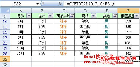 有时需要在Excel表格中动态地反映筛选后数值的变化情况,如下图中F32单元格中的合计值会随着不同的筛选情况而变化。我们知道,用SUBTOTAL函数可以求出筛选后可见单元格的数值和或平均值等,因为SUBTOTAL函数会忽略不包括在筛选结果中的行。例如下图是筛选“商品名称=袜子”、“类别=男”时的结果,其中F32单元格中的公式为: