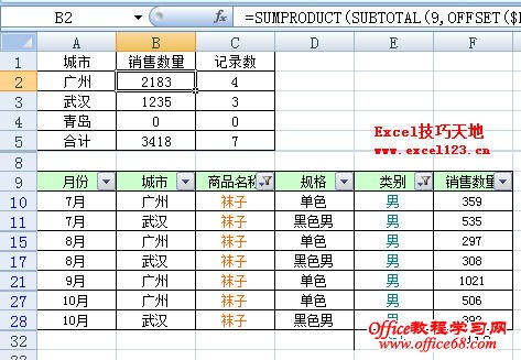 但如果此时还需要动态地反映筛选后各城市的合计值,即进行筛选后的条件求和,仅仅使用SUBTOTAL函数无法实现。虽然用多条件求和公式可以得到计算结果,但我们的目的是要随着不同的筛选操作,能够动态实时地反映数据的变化情况,因而此处不宜使用多条件求和公式。关于多条件求和公式,可以参考本站《用公式进行多条件求和》一文。
