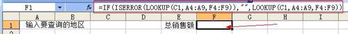 再选择F1单元格,剪切原本的公式,重新输入“=IF(ISERROR(A),"",A)”,然后将原本的公式“LOOKUP(C1,A4:A9,F4:F9)”粘贴取代“A”,写成“=IF(ISERROR(LOOKUP(C1,A4:A9,F4:F9)),"",LOOKUP(C1,A4:A9,F4:F9))”,按回车确认。此时,即使C1单元格为空值等,F1单元格也不会再显示错误值“#N/A”。