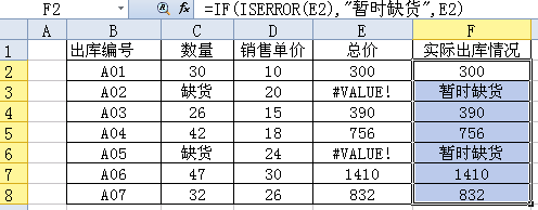 1.当“提货数量”列中显示“缺货”字样时,“总价”列则会出现错误值,因此选中F2单元格, 在公式编辑栏中输入公式: =IF(ISERROR(E2),"暂时缺货",E2), 按Enter键根据ISERROR函数判断的结果,返回产品实际出库信息。