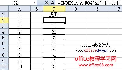 又如这样的,A列是一些数字,分别题取A1,A11,A21,A31,A41等等。我们在C1输入下面的任意公式完成提取: