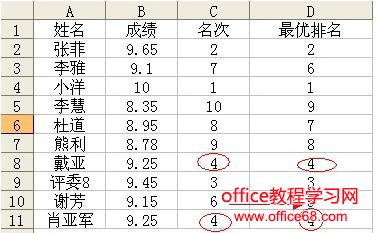 使用excel中rank函数进行排位时,当出现相同名次时,则会少一个名次。比如出现两个第4名,则会自动省去名次5,我们可以按如下方法设置公式来彻底解决当出现同分同名次时缺省名次数的问题。 从表中我们可以看到戴亚和肖亚军的成绩都是9.25,相同的分数,两个都排在第4名,然后谢芳就是6名,名次中就没有了第5名。在实际中这样的排名不符合常规,所以我们重新设计一下公式,操作方法如下。 |