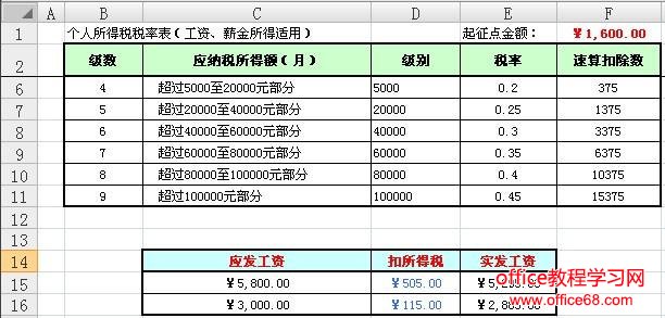 假设C16单元格的应发工资为3000元,以下公式可以返回所得税额: