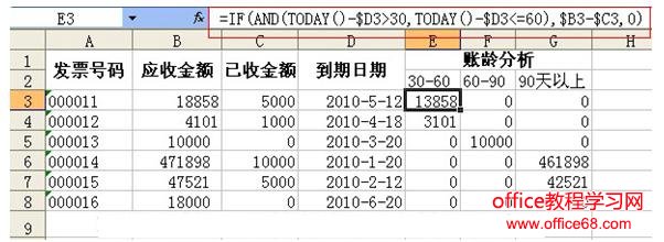 ![]() 输入公式:=IF(AND(TODAY()-$D3>30,TODAY()-$D3<=60),$B3-$C3,0)。按回车键,判断第一项应收账款的账龄是否在30-60天范围内。如果在,返回金额,如果不在,返回0值。 |