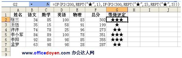 第一,选中G2单元格,在编辑栏输入公式:=IF(F2<200,REPT("★",1),IF(F2<300,REPT("★",2),REPT("★",3))),按下回车键,即可根据F2单元格中的分数,自动返回指定数目的“★”号。
