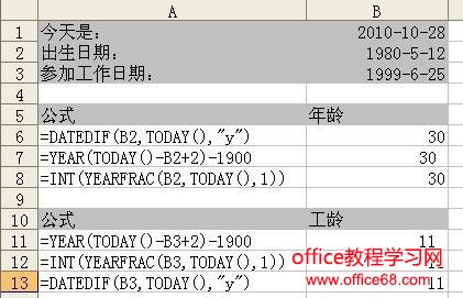 计算年龄和工龄,既可以使用YEAR函数,也可以使用DATEDIF函数,或者使用YEARFRAC函数。 ![]() |