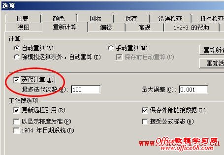单击菜单“工具→选项→重新计算”,勾选“迭代计算”,然后单击“确定”。