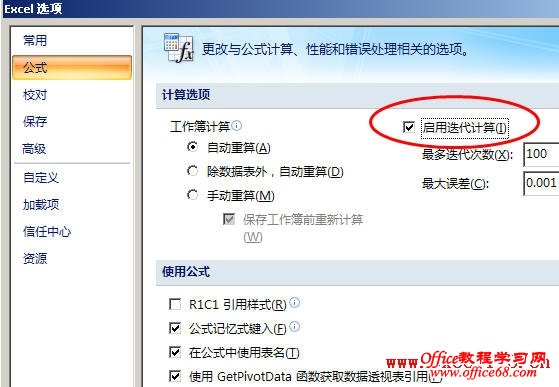 单击“Office按钮→Excel 选项→公式”,在“计算选项”区域中,勾选“启用迭代计算”选项。