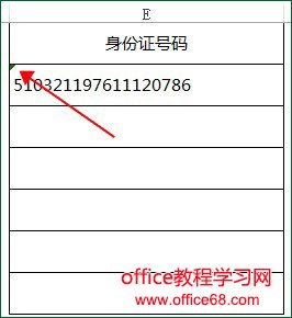 当我们敲下键盘的回车键,确认输入。咦!Excel怎么会这么不厚道,还对我输入的身份证号码动手脚呢,不经过我同意,就显示成下面这样了!