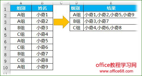 下面我们通过一个例子:如下图,A、B列为数据源,分别为组别和姓名,目标是组织成D、E列的格式:
