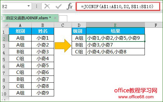 EXCEL中VBA函数其中使用自定义函数JOINIF函数连接文本