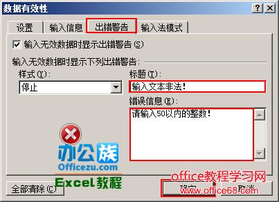 3 现在切换到“出错警告”选项卡,然后大家可以根据自己的需要设置输入无效数据时显示的出错警告,例如,我们设置成弹出标题为“输入文本非法!”,信息为“请输入50以内的整数”的“停止”样式对话框。