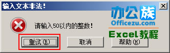 4 返回到Excel中,如果我们现在输入无效数据“60”,然后敲回车键,会弹出一个“停止”样式的对话框,单击“重试”按钮,直到我们输入有效数据“2”时,敲击回车键,会显示数据已经输入到工作表中,并自动选中下一个单元格。