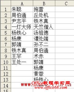 如果有两列相似的数据,要在其中一列中找出在另一列中重复的内容,可以用条件格式,还可以使用公式来查找。这里介绍用公式的方法,假如在A1:A10和B1:B14有两列名单,现在要找出B列中与A列相同的数据,如图。