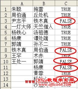 回车后双击填充柄,将公式填充到C2:C14区域。可以看到重复的数据在C列中都显示为“FALSE”,而不重复的数据都显示为“TRUE”。