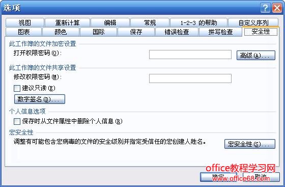 第一步:打开Excel程序,选取菜单中工具选项,打开选项设置窗口: 第二步:找到安全性...