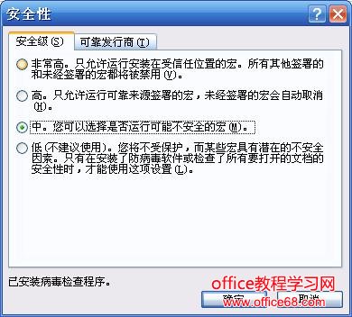 第一步:打开Excel程序,选取菜单中“工具”—“选项”,打开选项设置窗口: 第二步:找到“安全性”属性页,点击“宏安全性(S)”按钮,打开宏安全性设置窗口: 第三步:将安全性选择为 中或低 确定保存即可。 |