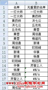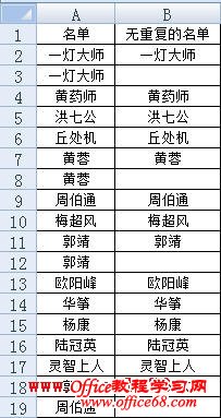如果Excel工作表的某列中包含一些有重复数据,要从该列中提取不重复的数据,即对于重复的数据仅保留一个,从而形成一列无重复的数据,除了使用高级筛选、数据透视表等方法外,还可以用公式来实现。提取不重复值的公式非常多,下面就是两个比较简单的。 假如在A2:A19中有一列名单,现在要将无重复的名单放在B列中。 公式一:用INDEX、MATCH和COUNTIF函数组成的数组公式 在B2单元格中输入数组公式: =INDEX($A$2:$A$19,MATCH(0,COUNTIF($B$1:B1,$A$2:$A$19),0)) 按Ctrl+Shift+Enter结束,然后拖动填充柄向下填充,直到出现“#NA”为止。 公式二:不显示重复的数据的公式 在B2单元格中输入公式: =IF(COUNTIF($A$2:A2,A2)=1,A2,"") 然后拖动填充柄到B19单元格。 该公式让重复的数据显示为空值,虽然这些数据看起来不连续,但也得到了不重复的数据 |
