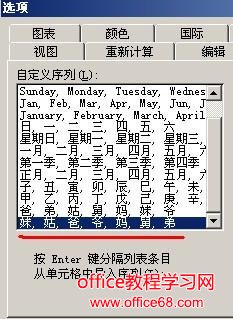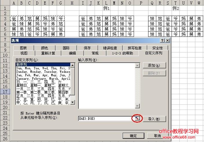 Excel2003下,选菜单栏“工具”-“选项”-“自定义序列”