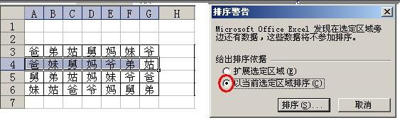 先是实现例1的排序,数据首行的排序已经正确了,我们先拉选第二行。然后点菜单栏的“数据”-“排序”。排序警告页,勾选“以当前选定区域排序”,然后点“排序”。