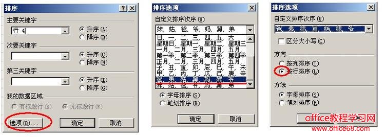 来到排序选项卡,点其左下角的“选项”。来到排序选项,先选择我们自定义的排序,然后在方向选卡下选“按行排序”,确定,再确定。