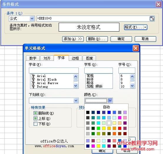 第一步:如上例选E2:E10,点击格式-条件格式,选择公式,点击E10单元格,显示=$E$10,输入0,在格式按钮中设定格式,表示当合计为0时,E列数值的字体为白色,如下图1: