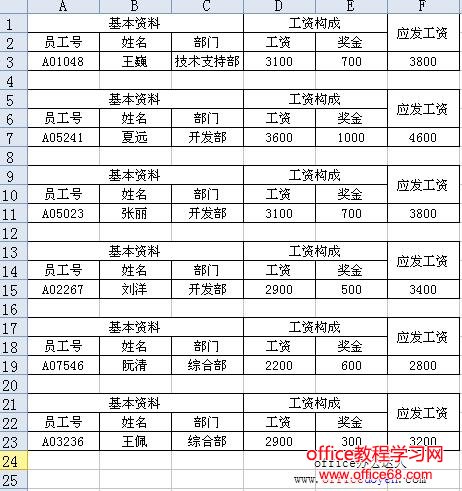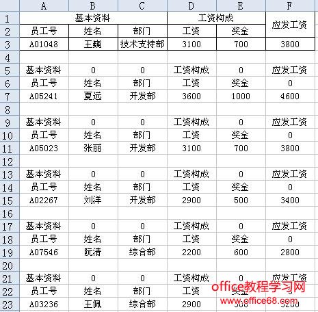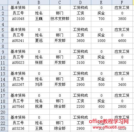 “Excel中单行工资条的制作方法”中详细介绍了单行工资条的制作。在本文我们,在来看看双行工资条的制作方法。 其实双行工资条和单行工资条的制作方法基本一致,唯一的是公式稍有些差异。 接下来依然是美化工资条,单击工具栏的“边框”下面的“绘图边框”,合并部分单元格,增加边框,总之,使其美观即可。 |