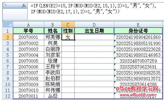 为了便于大家了解上述公式的设计思路,下面简单介绍一下它的工作原理:该公式由三个IF函数构成,其中“IF(MOD(MID(C2,15,1),2)=1,"男","女")”和“IF(MOD(MID(C2,17,1),2)=1,"男","女")”作为第一个函数的参数。公式中“LEN(C2)=15”是一个逻辑判断语句,LEN函数提取C2等单元格中的字符长度,如果该字符的长度等于15,则执行参数中的第一个IF函数,否则就执行第二个IF函数。