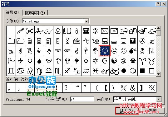 ![]() 点击符号图标 2 在弹出的“符号”的对话框中,单击“符号”选项卡,在字体后面输入“Wingdings”,然后鼠标在对话框中其它任一地方单击;