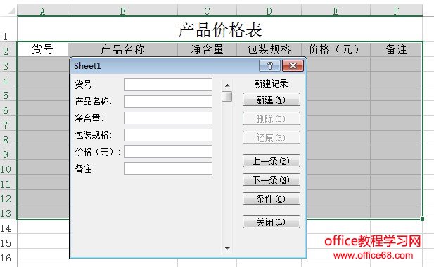 比如我们需要在“产品价格表”中输入数据。在打开的“记录单”对话框里,我们可以方便的对每一个记录进行输入。