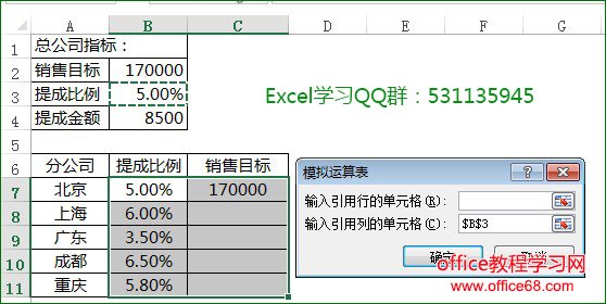 ![]() 弹出的“模拟运算表”中,在“输入引用列的单元格”框中输入B3单元格,也就是提成比例。