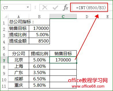 第一步,我们在C7单元格输入公式:=INT(8500/B3),得到北京分公司的员工目标销售额为17万。