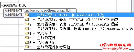 AGGREGATE是Excel 2010中新增的函数之一,它可以返回列表或数据库中的合计。 AGGREGATE不仅可以实现诸如SUM、AVERAGE、COUNT、LARGE等19个函数的功能,而且还可以忽略隐藏行、错误值、空值等。如果区域中包含错误值,SUM等函数将返回错误,这时用 AGGREGATE函数就非常方便了。其引用形式的语法为: AGGREGATE(function_num, options, ref1, [ref2], …) 其中第一个参数“function_num ”为一个介于1到19之间的数字,指定要使用的函数,见下表。