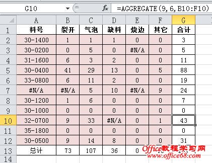第二个参数“options”为为一个0至7之间的数字,指定要忽略的项目。在单元格中输入该函数的第二个参数时,Excel会自动给出该参数的选择列表,如图。 第三个参数“ref1”为区域引用或一个数组,第四个可选参数“[ref2]”为某些函数必需的第二个参数。 AGGREGATE函数与SUBTOTAL函数有点类似,当SUBTOTAL函数的第一个参数为“101-111”之间的数字时,就会忽略隐藏值,但SUBTOTAL函数不能忽略错误值。 例如在下图的A2:F12区域是由公式返回的动态数据区域,其中某些单元格可能会返回错误值,要对这些包含错误值的区域求和,在Excel 2010中使用AGGREGATE函数更为简洁。 如果在G10单元格中输入公式: =SUM(B10:F10) 公式返回错误“#N/A”。而公式: =AGGREGATE(9,6,B10:F10) 会忽略错误值而返回B10:F10区域的合计值。 值得注意的是,AGGREGATE函数只能忽略隐藏行,而不能忽略隐藏列 |